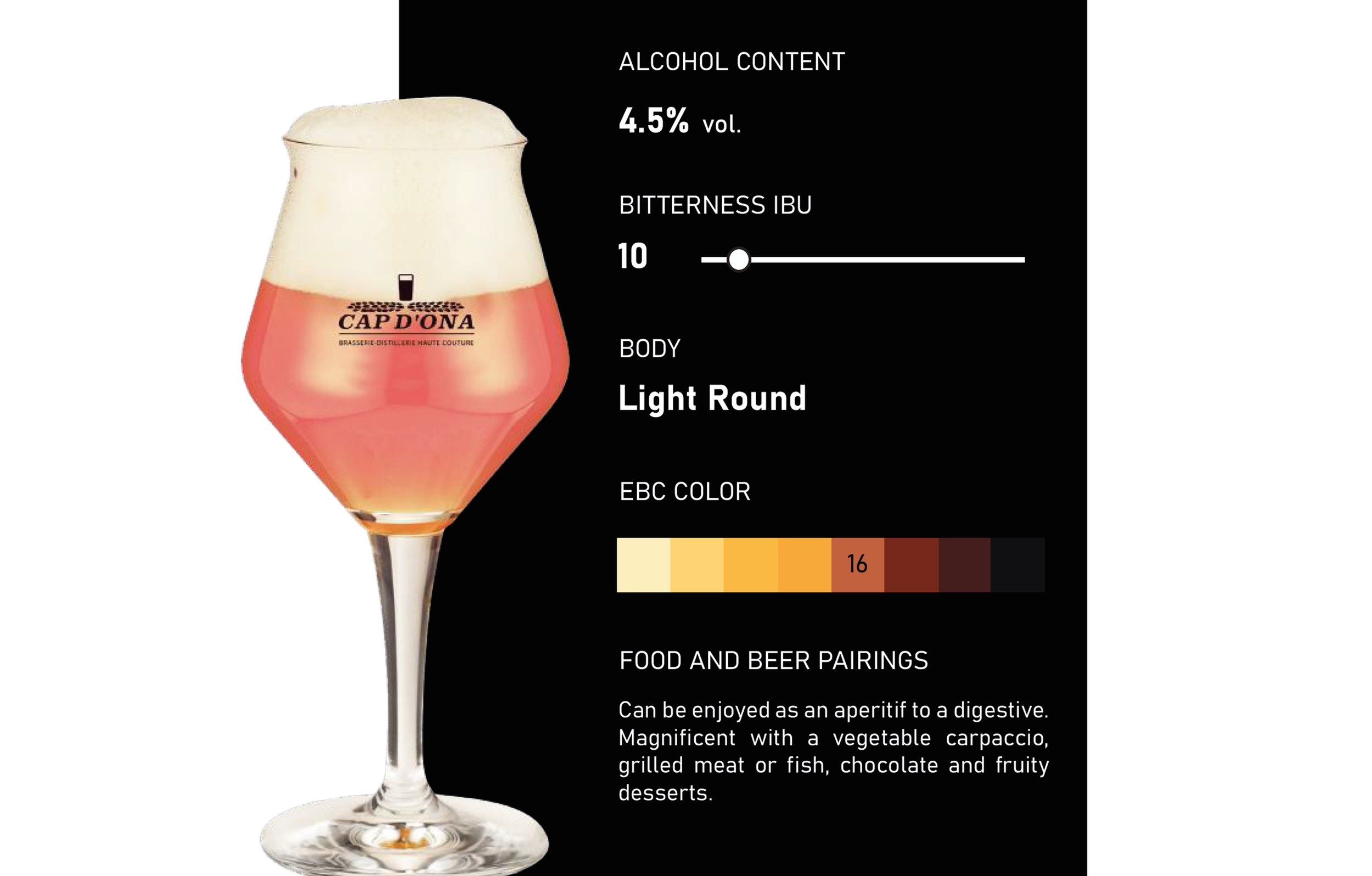 Organic white beer with Roussillon peach, with a pink velvet reflection. It is of a unique sweetness, of a rare nobility and delicacy. Without added flavourings or sugars. Part of the essential trilogy "Les Fruitées Nature d'été"